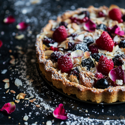 Freshly baked almond pastries are met with sweet berries, creamy fudge, rose petals and a hint of desiccated coconut.